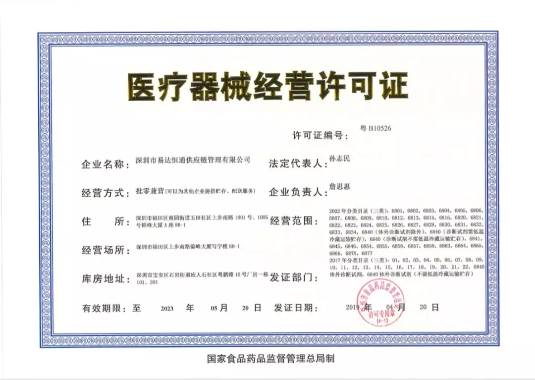易达恒通是深圳市四家拥有医疗器械第三方物流资质企业之一,拥有完善的设施与设备、高质量的仓储管理、系统性的出入库流程、专业的服务队伍和具有符合医疗器械经营质量管理要求的计算机信息管理和供应链系统,从而保证医疗器械的安全性、有效性、可追溯性。