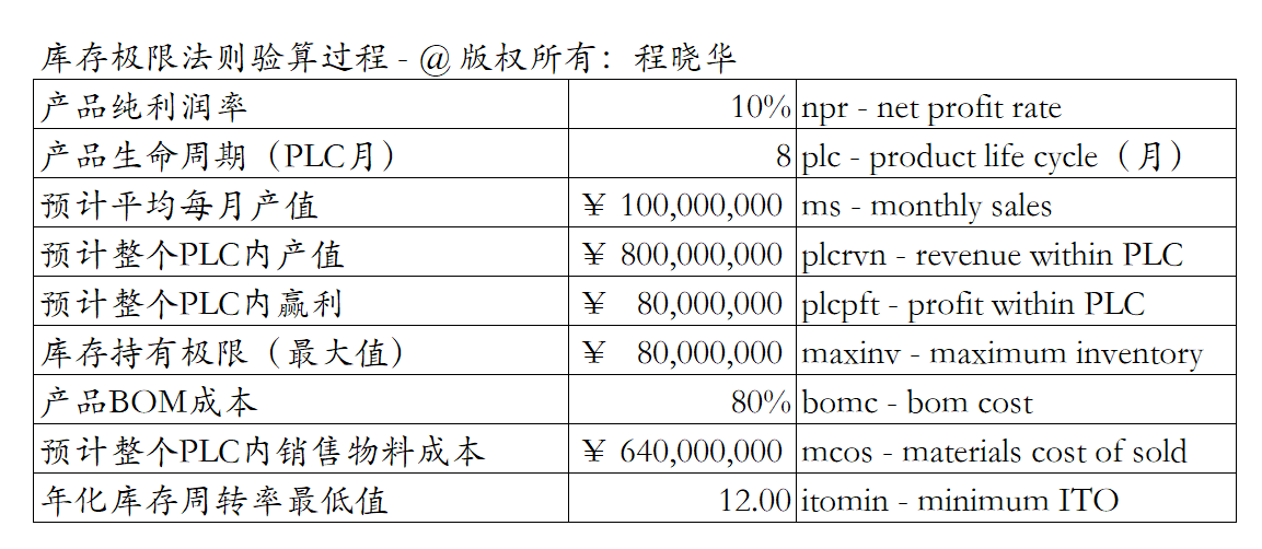 应该说,从纯粹数学意义上讲,这个所谓的“库存极限法则”推导过程不是很严格,但该法则的根本意义在于给企业的库存规划(Inventory Planning)设置了一个底限 – 你的库存最大不能超过多少个月的(产品生命周期x 纯利率/ BOM成本百分比),否则,那就是在危险运营了。