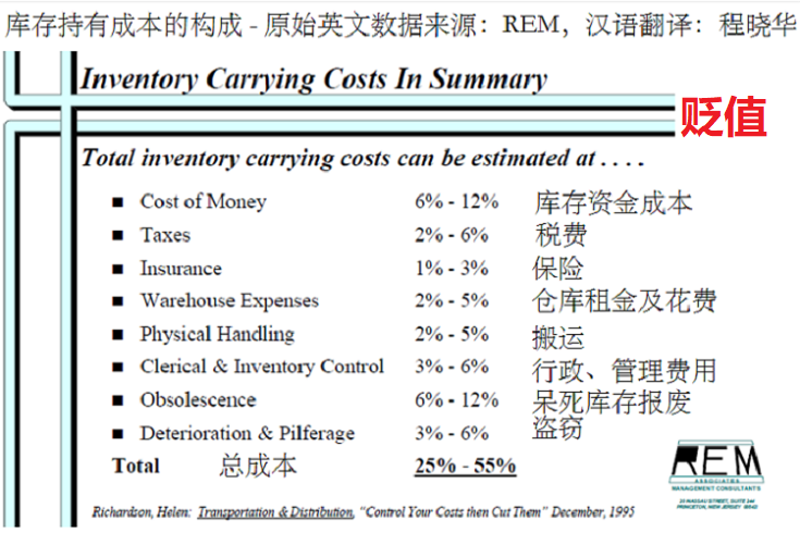 譬如说一般行业的年库存持有成本比例在25% ~ 50%之间,很多公司的财务在提取月度库存持有成本的时候,都是按照2%来取值,也就是年度按照平均库存的2% * 12 = 24%来提取成本。